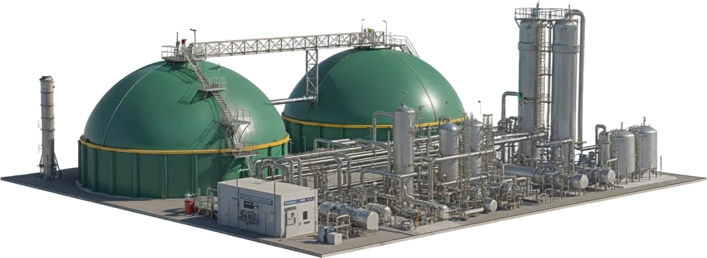 Purificação com alta eficiência para biometano e coprodução de CO₂, com automação, rastreio de performance e sistemas de segurança.